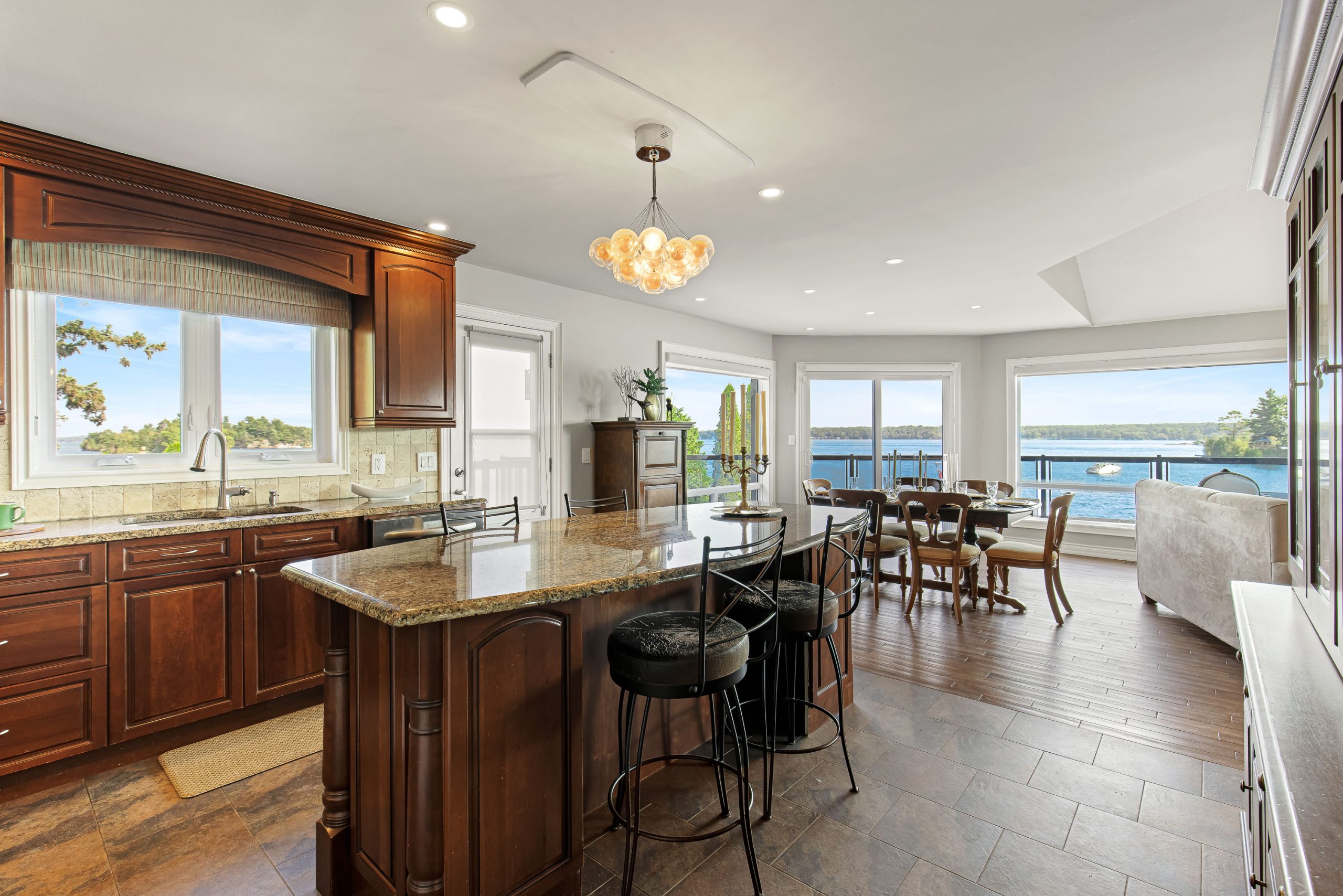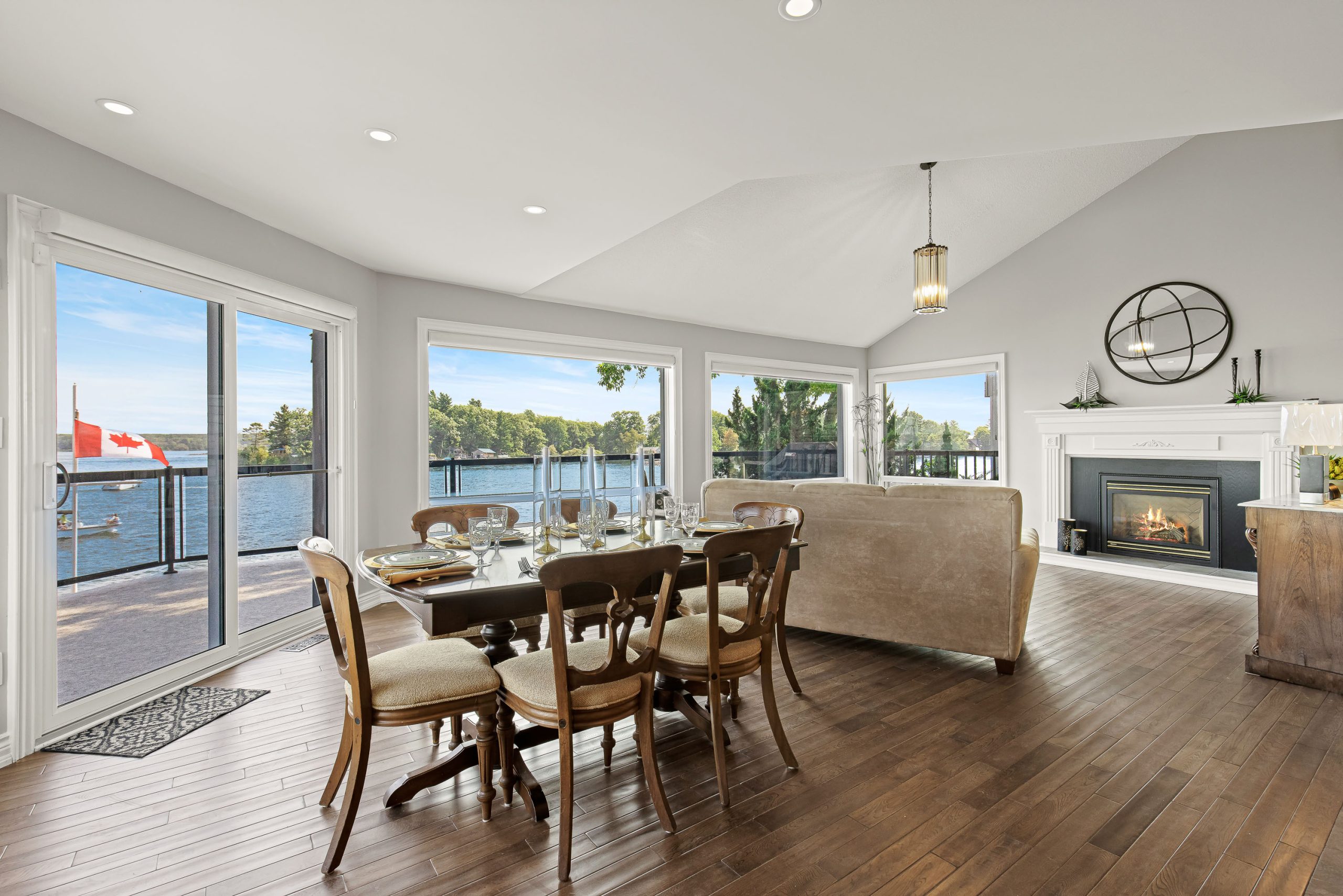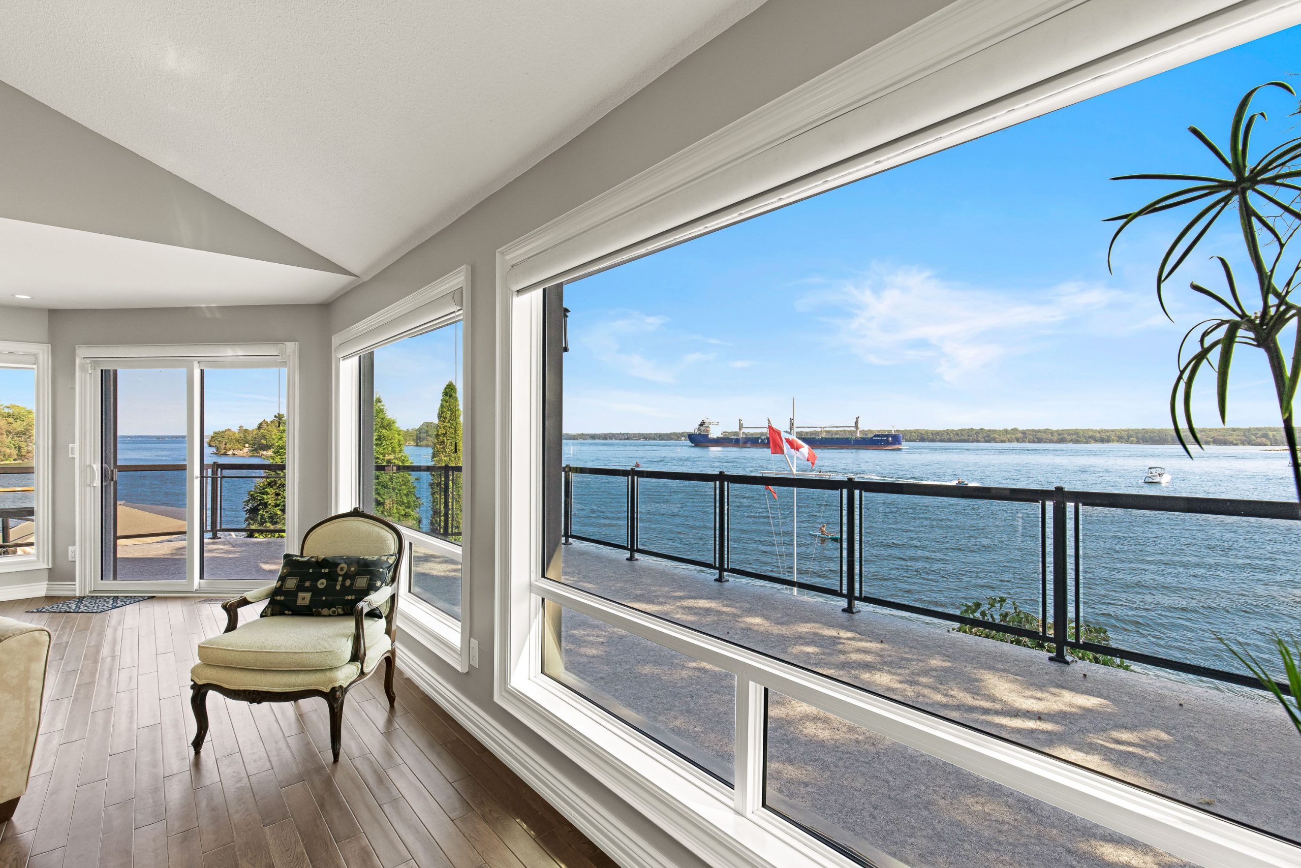 Located within the City of Brockville, yet offering the privacy of a riverfront retreat, 9 Bayview Road provides front-row views of the great ships navigating the world-renowned St. Lawrence Seaway. Just minutes from downtown Brockville, yet worlds away in its waterfront serenity. Life on the St. Lawrence River offers a rhythm and beauty that changes with every season, and this exceptional waterfront property captures it perfectly. Set among dramatic rock outcroppings and beautifully maintained gardens, the home blends natural landscape with thoughtfully designed living. A wall of south-facing windows fills the interior with natural light while framing sweeping panoramic vistas across the river. From the balcony or covered deck, watch international freighters glide past your shoreline, a remarkable spectacle found in only a select few waterfront locations in the world. Outdoor living is effortless with walkout access to the river, easy docking from a Kehoe dock, and a SeaDoo lift with storage facility ready for summer adventures. Spring brings fresh colour to the gardens and lively river activity, while summer invites boating, swimming, and waterfront gatherings. Autumn sunsets and peaceful winter scenes ensure beauty in every season. With private road access and guest parking on Bayview Road, this is a rare opportunity to own an exceptional city waterfront home on the St. Lawrence River.